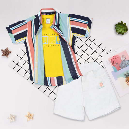 Bright & Bold: 3-Piece Set with Yellow Tee, Striped Shirt, Shorts!