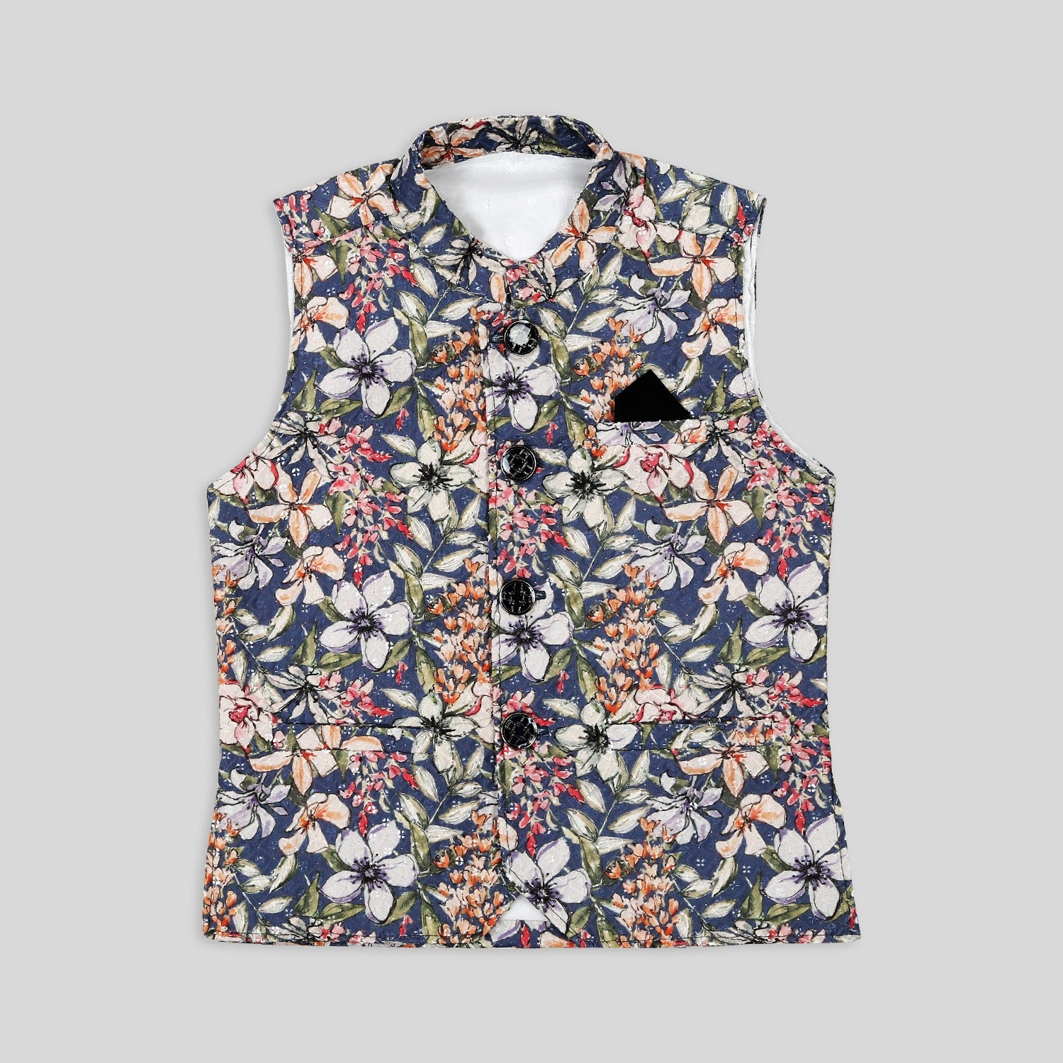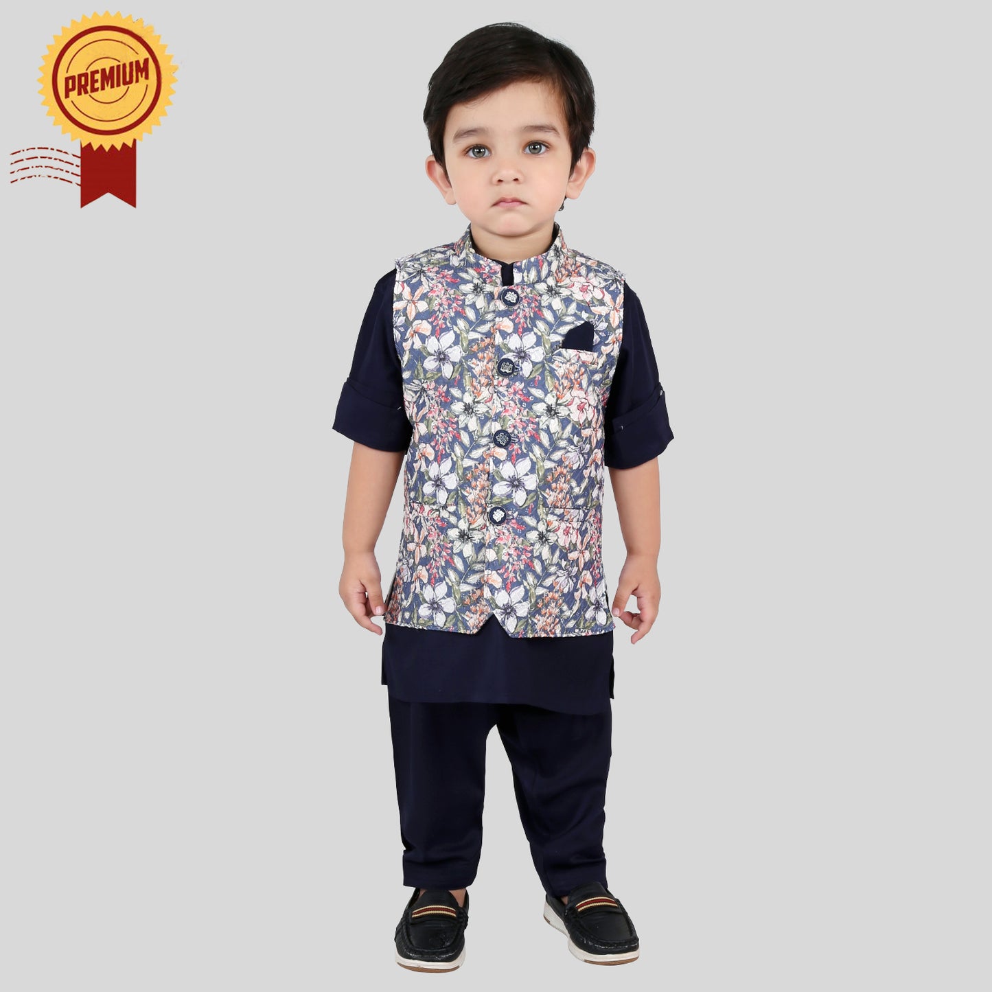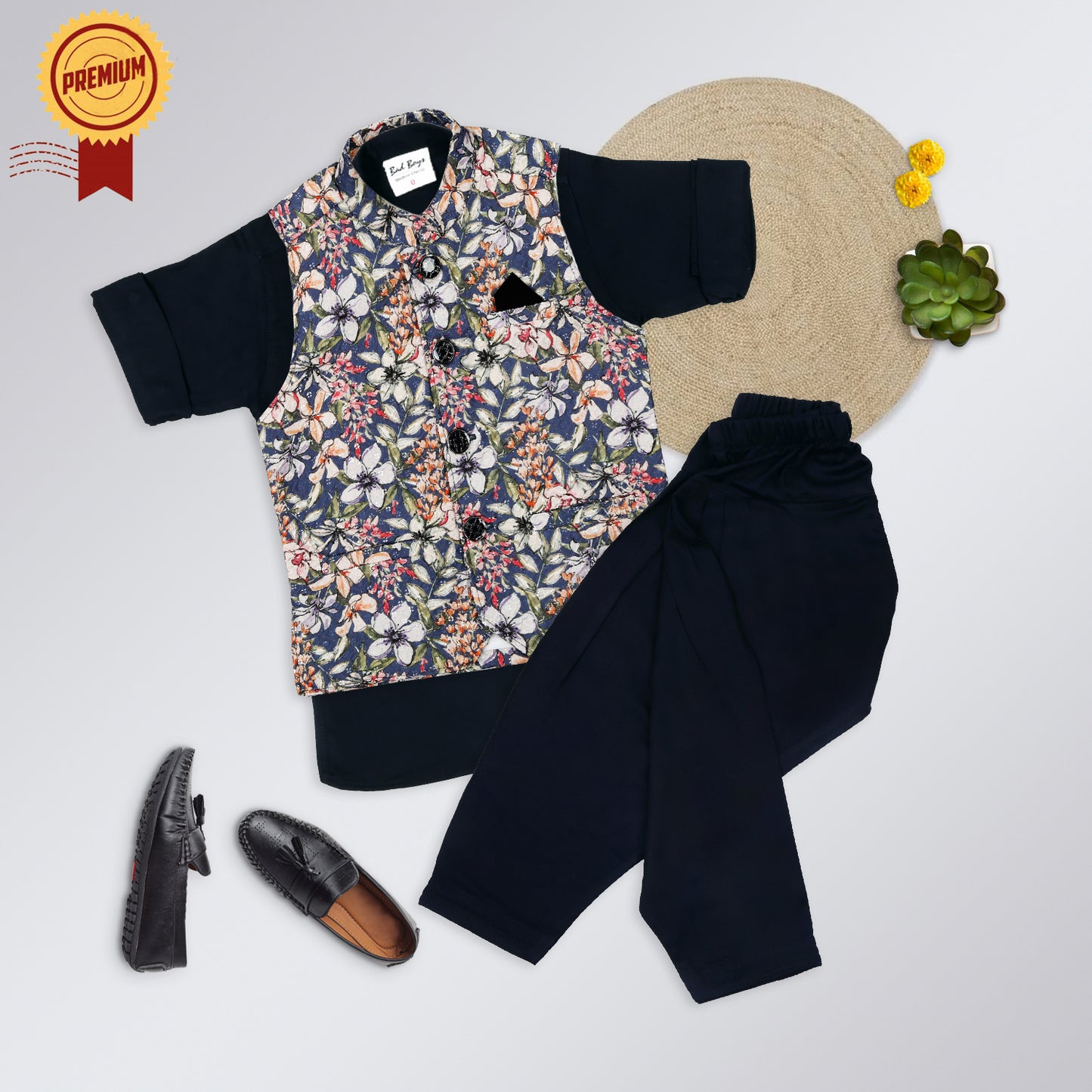 Set of 3 items: A rich quality rayon cotton kurta Pajama set with Digitally printed Koti/Jacket.