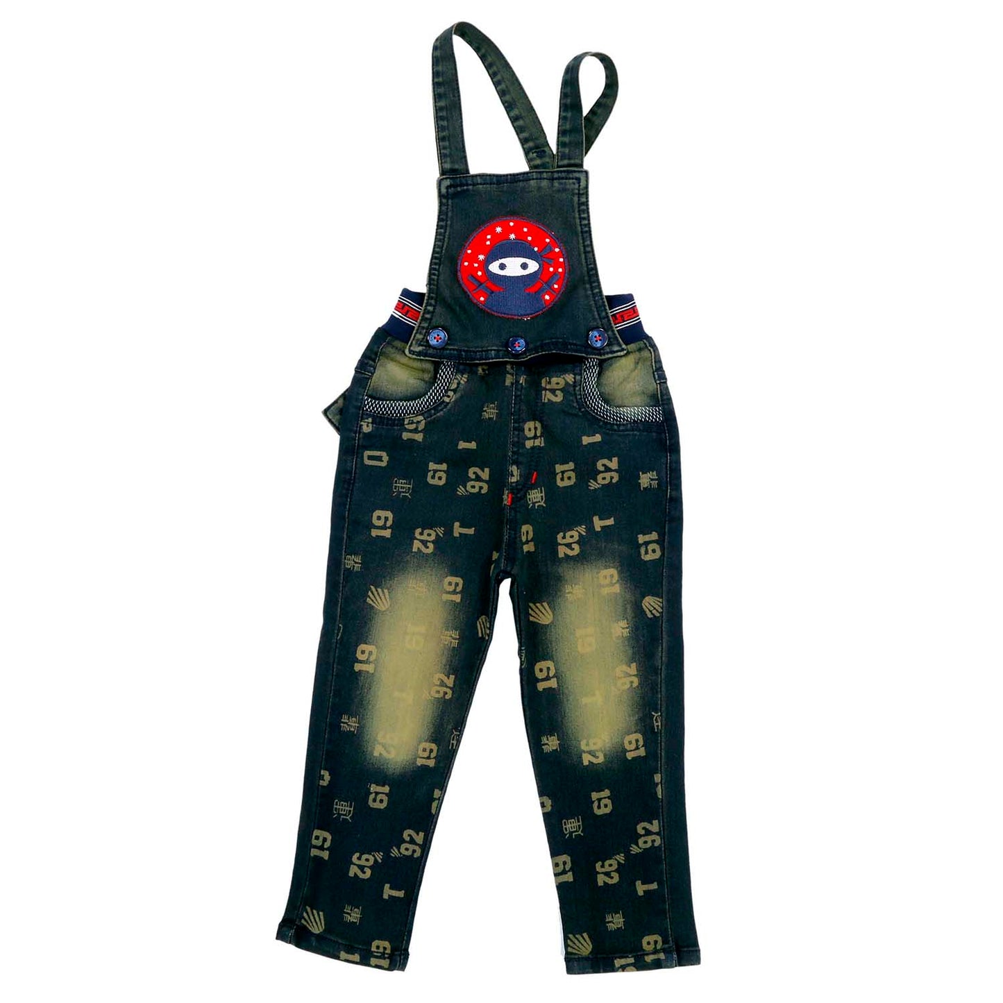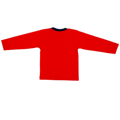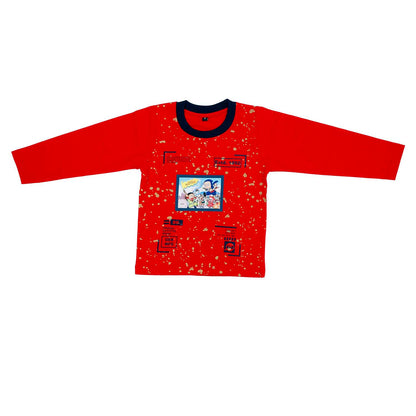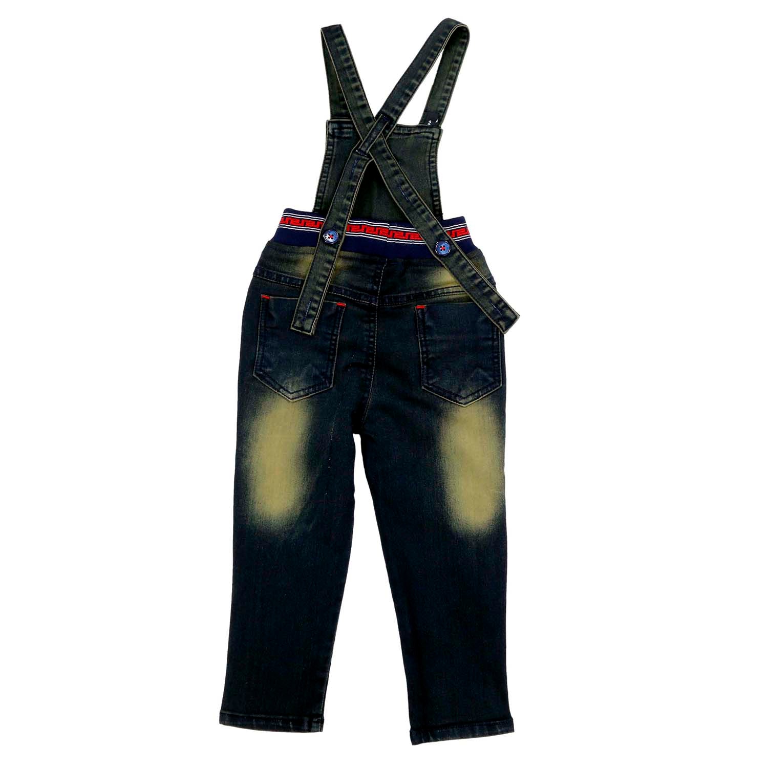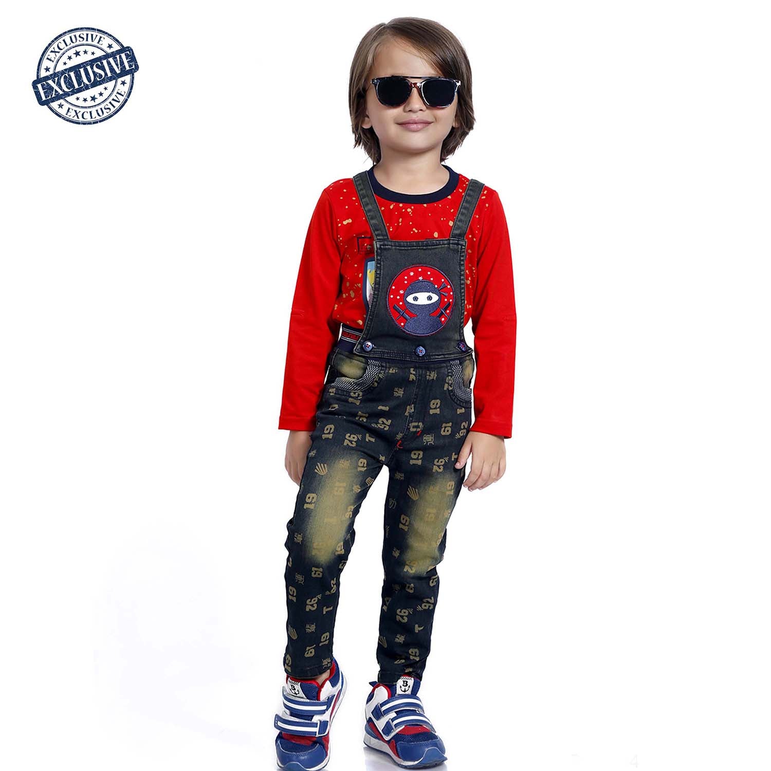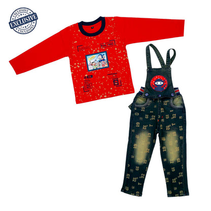 Set of 2 items: Complete set of a full-sleeves red t-shirt and printed denim dungaree with detachable top.