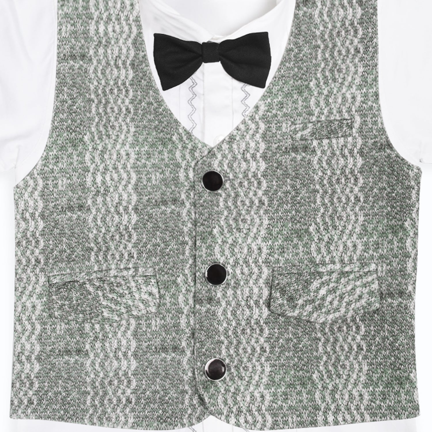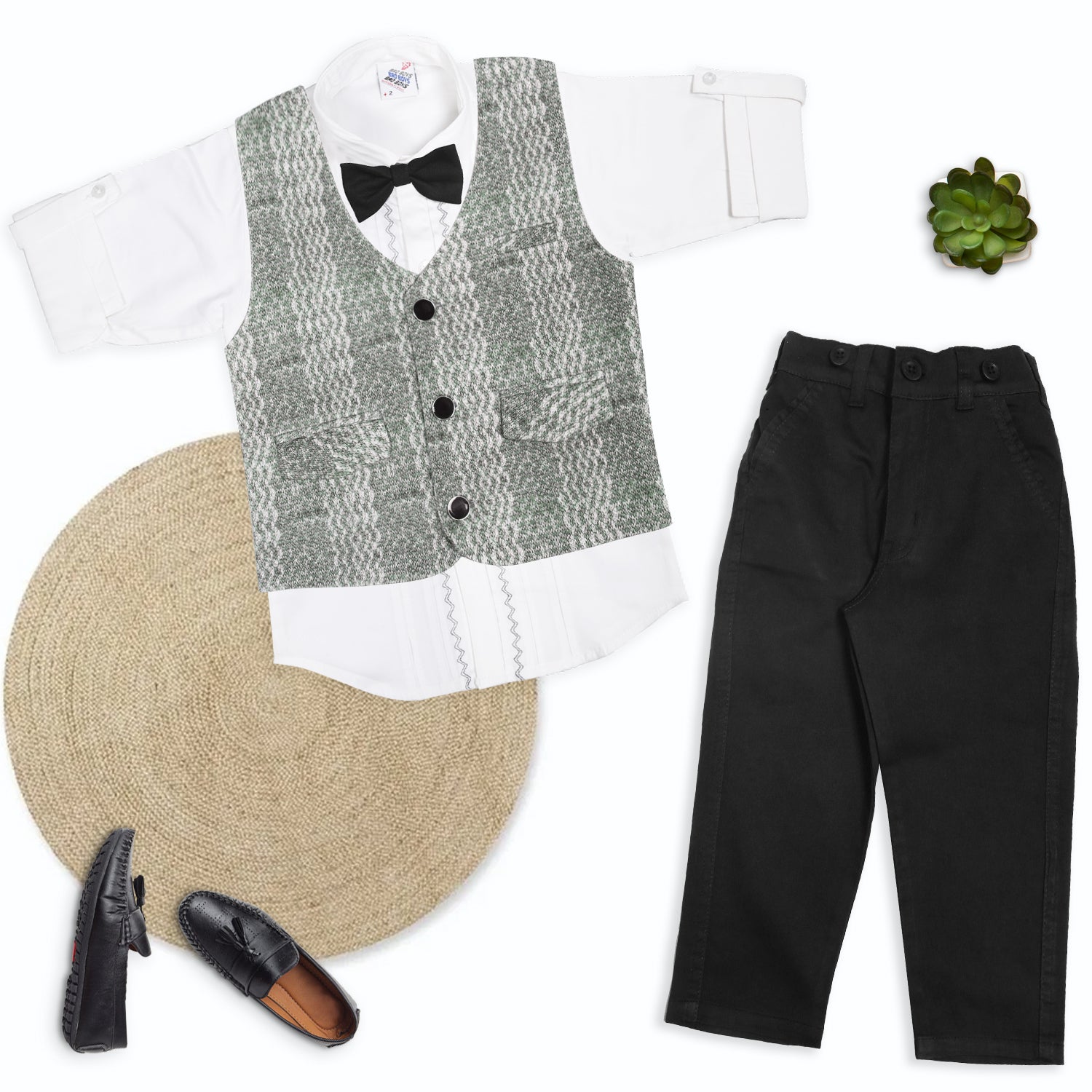 Turn every celebration into a stylish moment with this Shirt, Textured Waistcoat, Pant and Bow Set. Designed for little party icons, the crisp shirt pairs perfectly with a smart textured waistcoat for a charming layered look. The matching pants ensure comfort while keeping the outfit polished, and the adorable bow adds a playful finishing touch. Made from soft, breathable fabric, this set keeps your child comfortable through every laugh, dance, and photo moment. Ideal for birthdays, weddings, and festive gatherings, this party set brings big style to tiny trendsetters. Ready, set, celebrate in style!