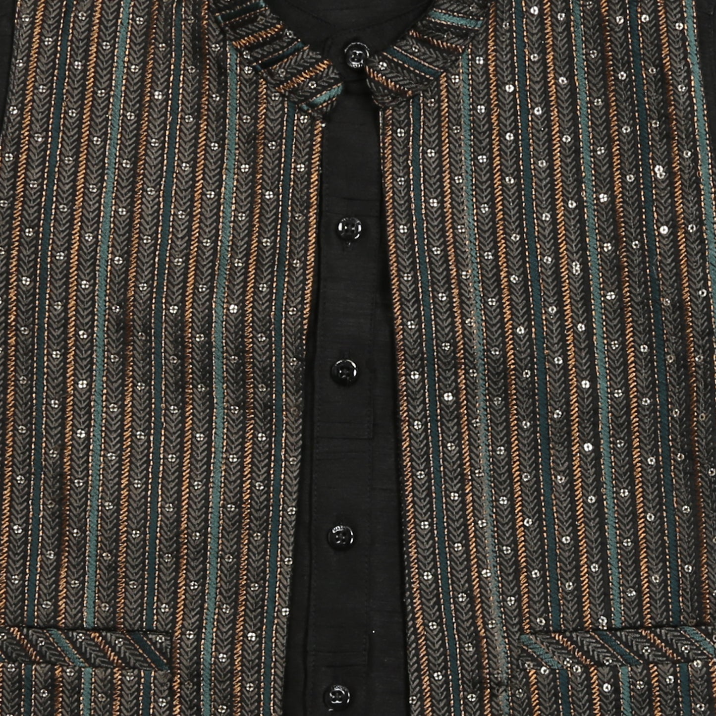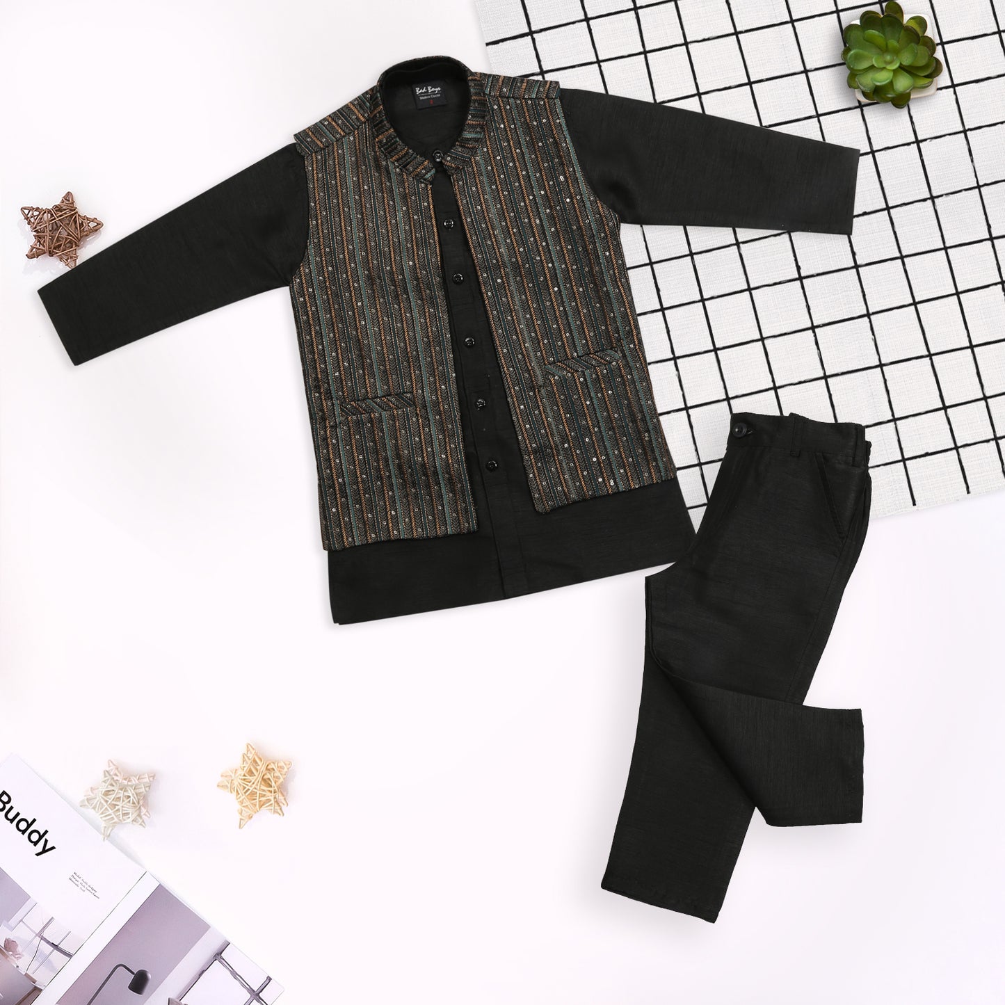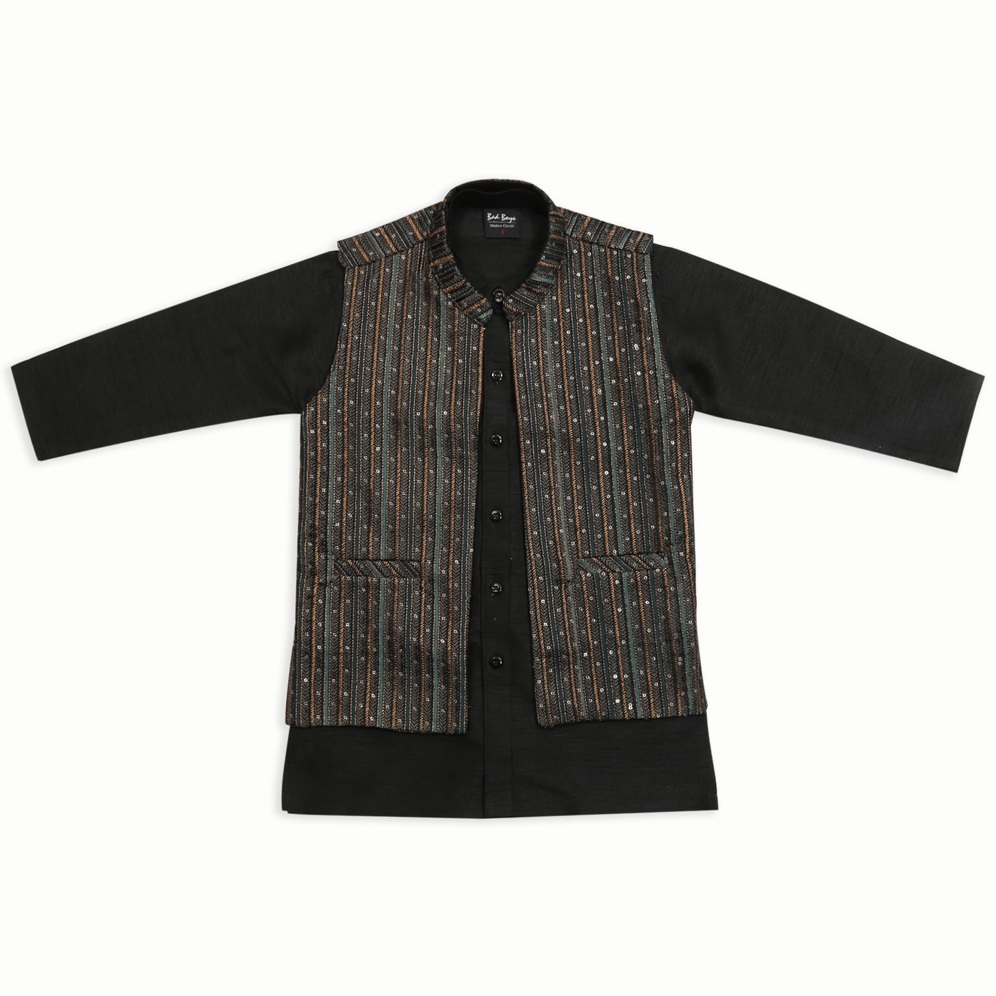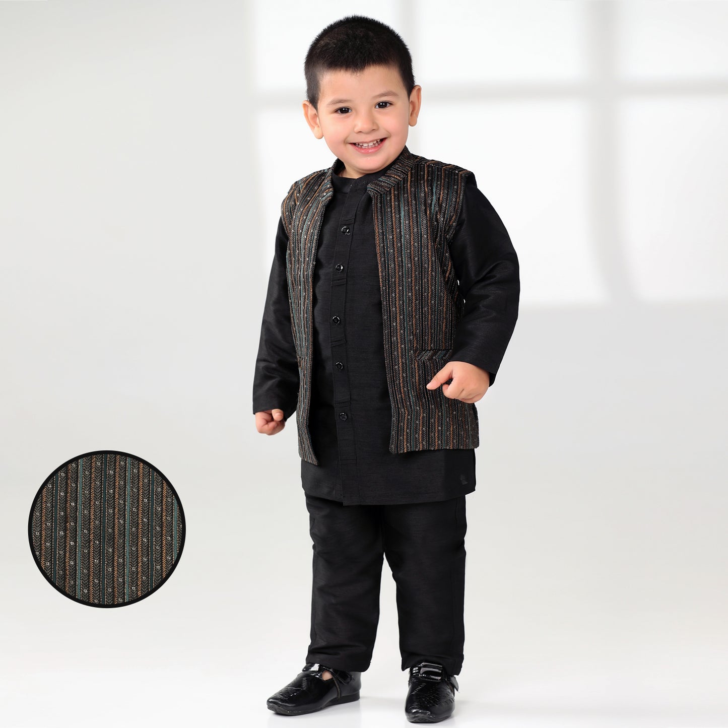 Get your little trendsetter celebration-ready in this dapper 3-piece ethnic set! Featuring a classic kurta, comfy pants, and a smart half-jacket, this outfit brings together traditional charm and modern cool. Perfect for weddings, festive parties, or any occasion that calls for a little extra flair. The half-jacket adds just the right touch of swagger, while the kurta keeps things rooted in timeless style. Whether he's dancing at a mehendi or stealing hearts at a family gathering, your mini fashion icon will turn heads and collect compliments. It’s not just an outfit—it’s a celebration in itself!