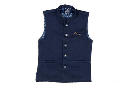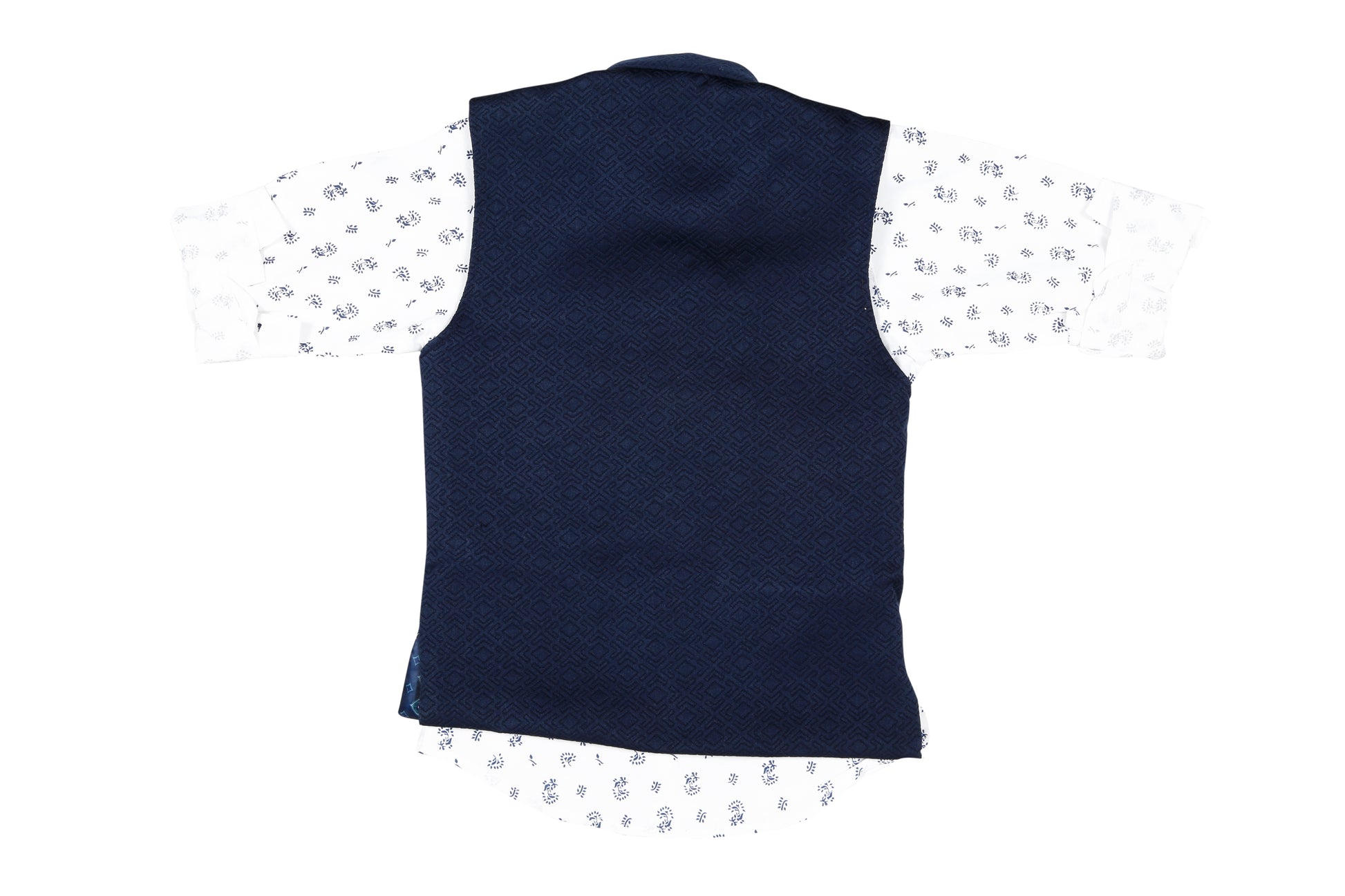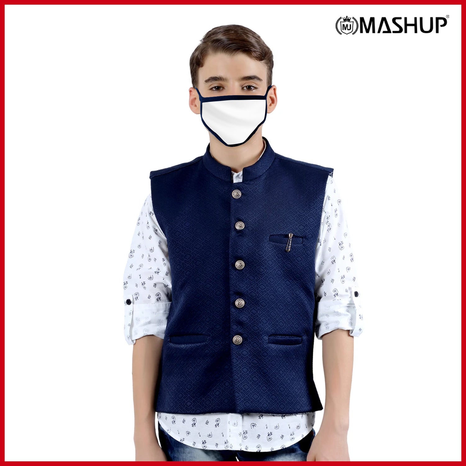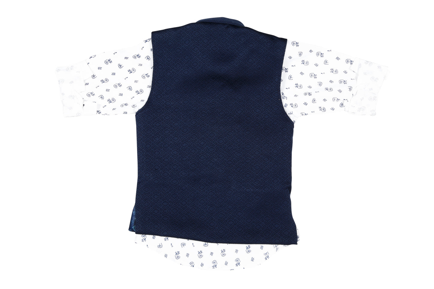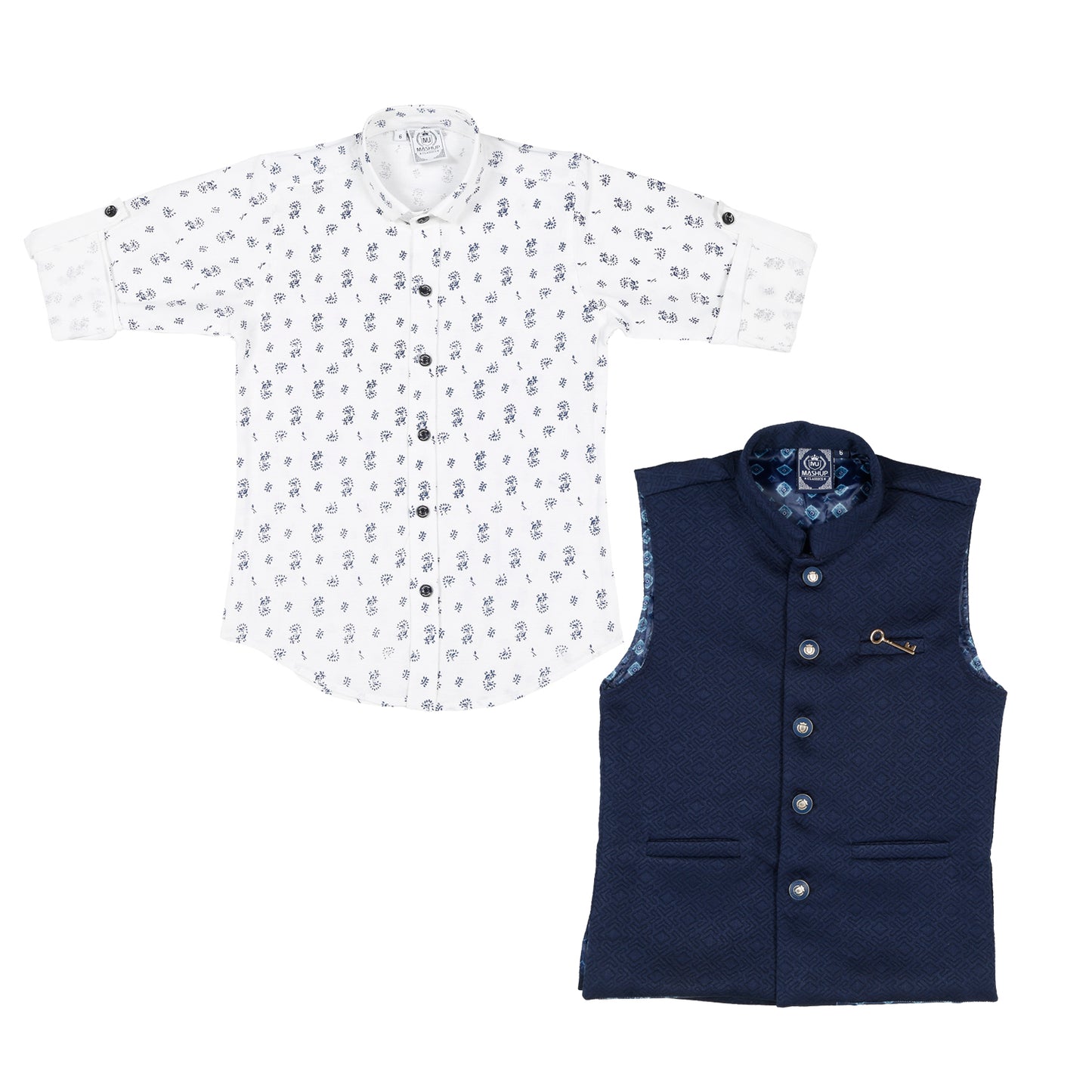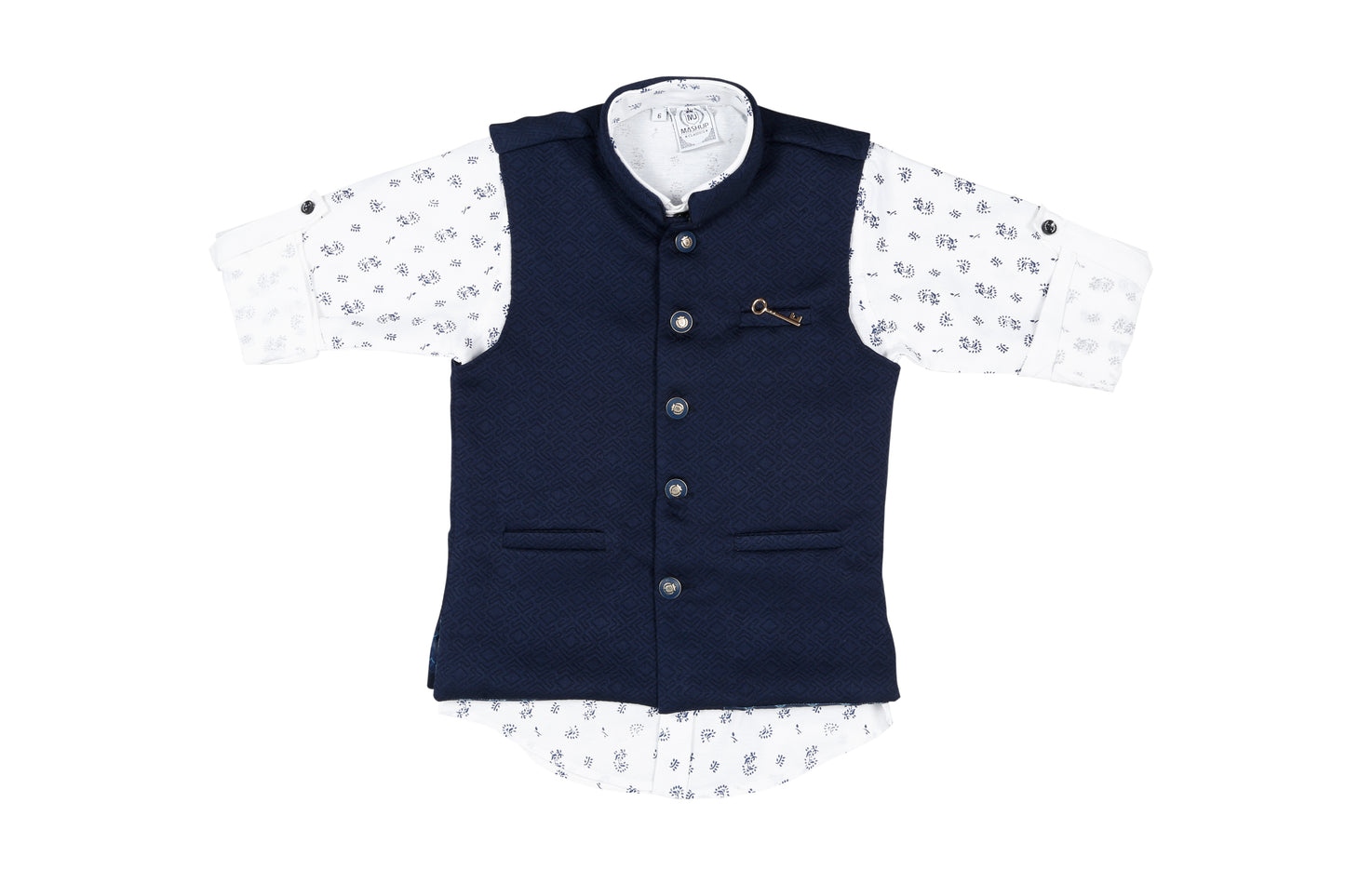Let him make a style statement at the next party in this trendy leaf printshirt and block textured waistcoat from MashUp. Feel & fabric: *Made from skin friendly cotton fabric to ensure your boy's comfort all day. Actual Colour: Waistcoat- Navy Blue, Shirt- White. Ideal Occasion: birthday parties, informal get-togethers and other festives. Style Tip: Complete the look with a pair of casual loafers for a stylish look. Care Tip: Gentle hand/machine wash in cold water. Dry in shade. Size guide: