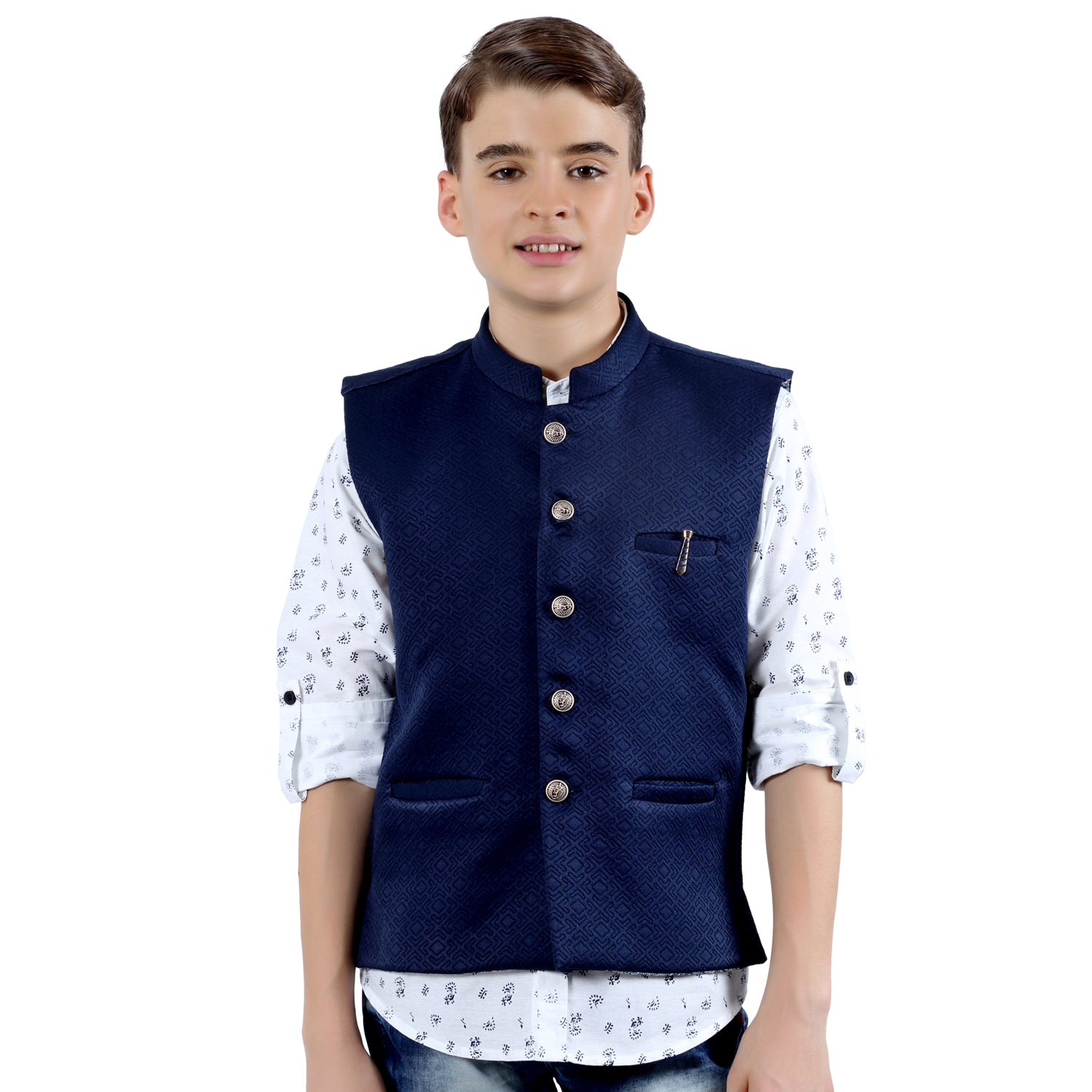 Dapper Nehru jacket and printed kurta shirt.